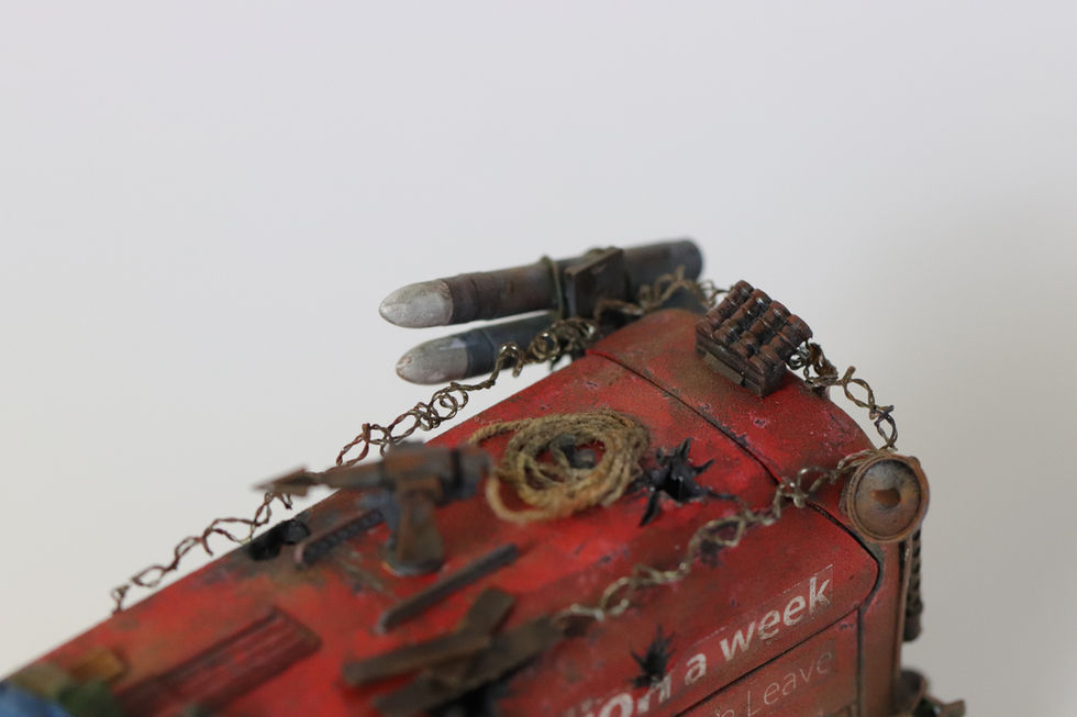 1:64 scale model post-apocalyptic Brexit bus made during lockdown and inspired by the DIY tabletop game Gaslands.